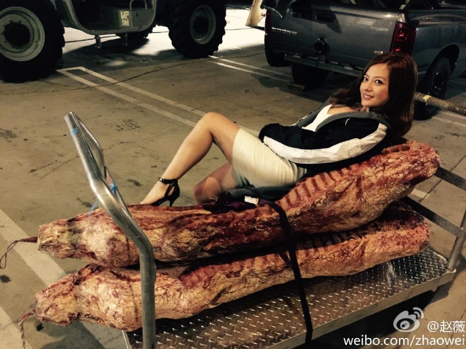 同时,赵薇还上传了多张杀青照,而赵薇当日更是身穿紧身短裙,横卧在道具猪肉上,支起一条腿,上围微露迷人事业线,为粉丝大送杀青福利,并留言说道,“剧组道具做的猪肉是不是太逼真了?哈哈,其实是塑料,躺在上面很舒服!”罕见的撩人姿势让不少网友大呼亮瞎眼。 图片来源:赵薇认证微博