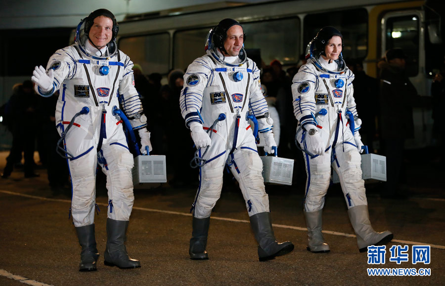 11月24日,在哈萨克斯坦的拜科努尔发射场,即将前往国际空间站驻站的3位宇航员,俄联邦航天署的安东·什克普列罗夫(中)、美国航天局的特里·维尔特斯(左)和欧洲航天局的萨曼莎·克里斯托弗雷蒂,准备登上飞船。俄罗斯航天部门24日凌晨在哈萨克斯坦的拜科努尔发射场用“联盟-FG”运载火箭将载人飞船“联盟TMA-15M”送往国际空间站。新华社/美联