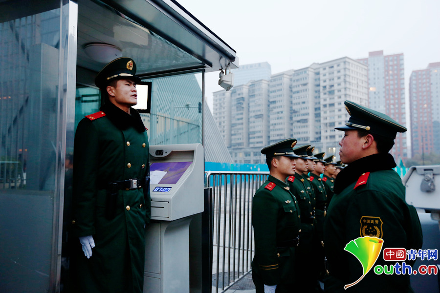 11月25日清晨,武警北京总队二师七支队十九中队老兵李伟(左),向新兵苗星宇交接他警营生涯的最后一班岗。中国青年网记者 张炎良 摄