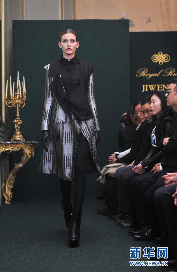 11月13日,在法国巴黎旺多姆广场,模特展示时装。为纪念中法建交50周年,助兴当日在法国首都巴黎召开的中法时尚峰会,以设计时尚男装闻名的JIWENBO高级成衣品牌发布会在巴黎旺多姆广场举行。新华社记者陈晓伟摄