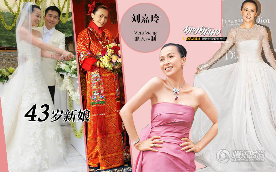 刘嘉玲:嘉玲姐姐与生俱来的贵妇范儿即使穿上充满浪漫气息的Vera Wang也是那么端庄霸气,和出席活动的Dior婚纱相比,印有雕花的抹胸婚纱品质看起来更无可挑剔。气质型女郎穿上中国传统服饰都如此与众不同,头别大红花都散发一股雍容华贵的气息,更别提那精致的手绣还有大金镯子,简直土豪。一直高梳的发髻不仅适合四十多岁精致女人的婚礼,也更衬得她婉约柔美。
