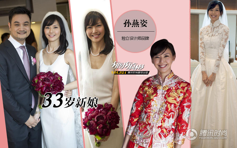 孙燕姿:为人着实低调的孙燕姿连婚纱都是那么独具一格,虽然是平板身材,但与众不同的绸缎背心连衣裙简约而不简单,流畅的线条让她荣光焕发。蕾丝的高龄蓬蓬婚纱相比更为华丽俏皮,只有一枚blingbling的戒指作为首饰简直是最大的炫耀。披霞戴凤的传统装扮,一看就是用商城的布料精心定制而成,很有古韵。