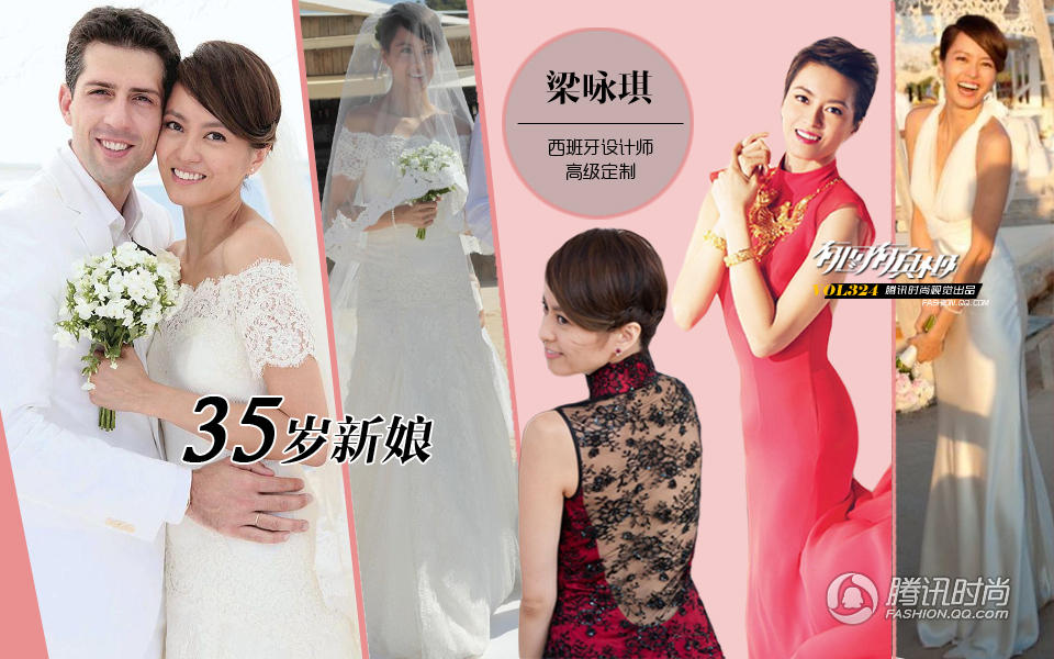 梁咏琪:小平肩的蕾丝婚纱把身材高挑的梁咏琪衬得小鸟依人,简单的裙摆没有过多的繁饰反而能凸显她保持水嫩的肌肤。一袭红色的露背蕾丝旗袍更是让一群老外看呆了眼,如此美哒哒的中国传统服饰实在是婚礼必备着装,虽然今年梁咏琪拍摄某大片也身着一件大摆尾的旗袍,但沉重的金首饰显得累赘了,特别是婚礼上的幸福笑容更是怎么都拍不出来的美。