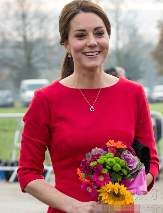 组图:凯特王妃红裙扎马尾美艳 弯腰小心护孕肚