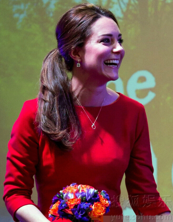 搜狐娱乐讯 英国诺维奇,当地时间11月25日,凯特王妃出席发布会,穿一袭红色礼裙,扎马尾美艳亮相。在与小女孩握手并与其交谈时,她微弯腰护孕肚很小心。