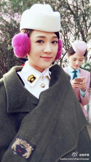陈乔恩[微博]更新微博,晒制服美照,并称:“今天气温降10度,冷歪简直动弹不得宝宝教官这个造型也是醉了,至于身后的沈同学和萧教官?这张主题我实在是没有灵感?”照片中,陈乔恩穿着帅气干练的白色制服,披着外套,因为天气降温,陈乔恩戴着紫色绒绒的保暖耳罩,映衬着白白的皮肤显得更加漂亮,而身后乱入的黄宗泽[微博]还刻意扭头看向镜头,和低头玩手机的郑爽形成鲜明对比,郑爽一身郑色制服装,尽显优雅大方。
