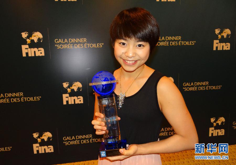 12月1日,中国选手刘蕙瑕在展示“年度最佳女子跳水运动员”奖杯。新华社记者周欣摄