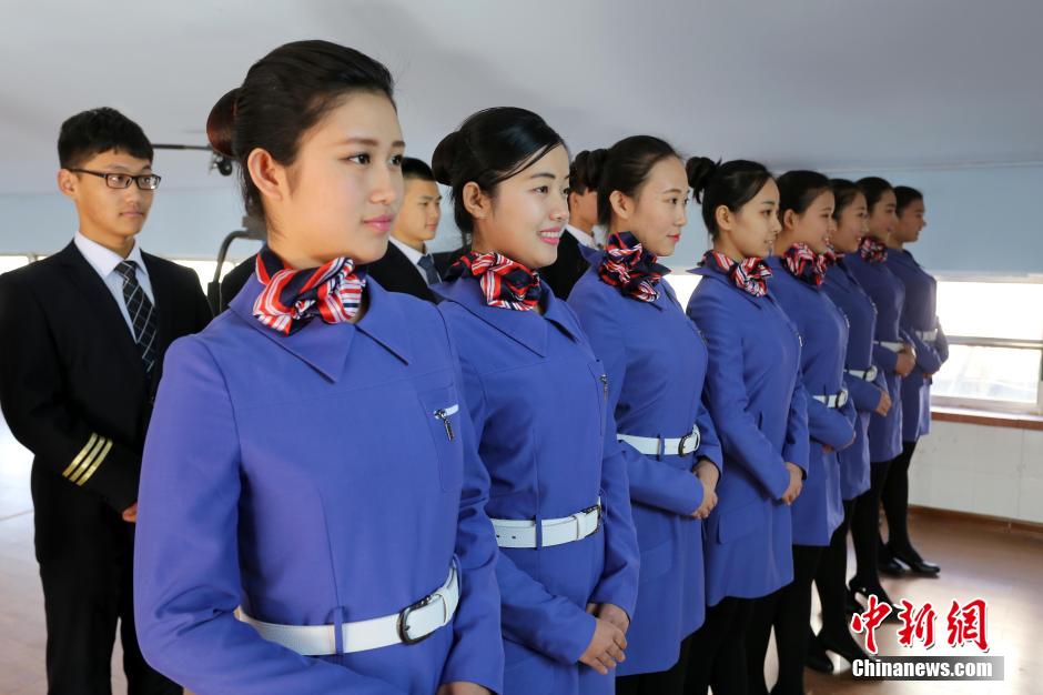 2014年12月1日,在山东省潍坊市区一家模特专业考前集训班上,学子们正在加紧训练。为了备战2015年艺考,来自潍坊市区的高三学子聚集在这个集训班上,进行形体、舞蹈、化妆、表演等科目的训练,迎接2015年高考模特专业及空乘等专业的考试。图为在山东省潍坊市区一家模特专业考前集训班上,学子们正在进行空乘专业训练。 中新社发 张驰 摄 图片来源:CNSPHOTO