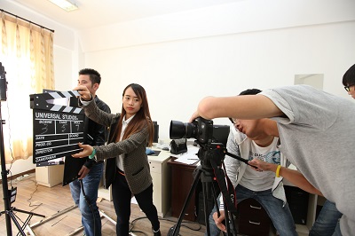 【不管是摄像师还是打板工作人员,都会认真对待自己的工作。图为青岛科技大学东方影都工作室在拍摄《Makers 青春 奋斗 创业 之我叫刘百万》微电影。】