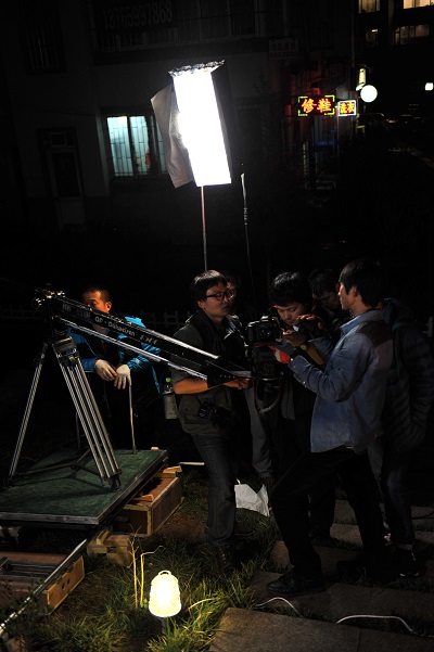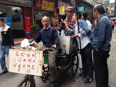 【团队在拍摄《风情街的故事》,走街窜巷收废品的老人和在街头摊主成为剧中主角。】