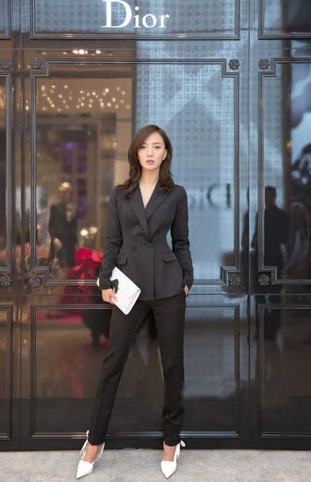 迪奥 (Dior) 迷你剧院展览首站在成都开幕,王珞丹一身黑色西服套装亮相,简练的西服款式,修身挺括,修身的长裤,显得更加的纤细,一双白色的高跟鞋与手包相互呼应,一种现代美的时髦呼之欲出。