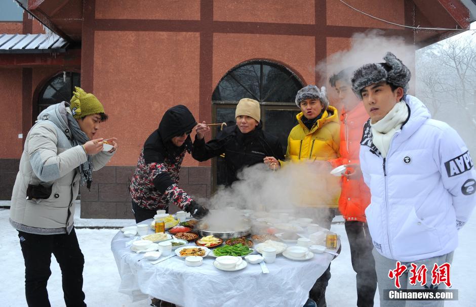 12月21日,馋嘴明星艺人品味峨眉山露天雪地火锅。当日,明星艺人温兆伦、张智霖、马可、尉迟琳嘉、张睿等来到四川峨眉山,赏峨眉山冰雪,品尝独具特色的雪地火锅,共同享受快铁时代的峨眉两天一夜新生活。刘忠俊 摄