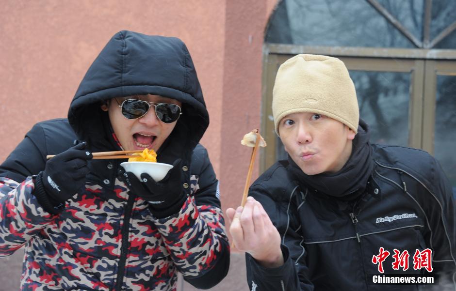 12月21日,马可和温兆伦品尝雪地火锅。当日,明星艺人温兆伦、张智霖、马可、尉迟琳嘉、张睿等来到四川峨眉山,赏峨眉山冰雪,品尝独具特色的雪地火锅,共同享受快铁时代的峨眉两天一夜新生活。刘忠俊 摄