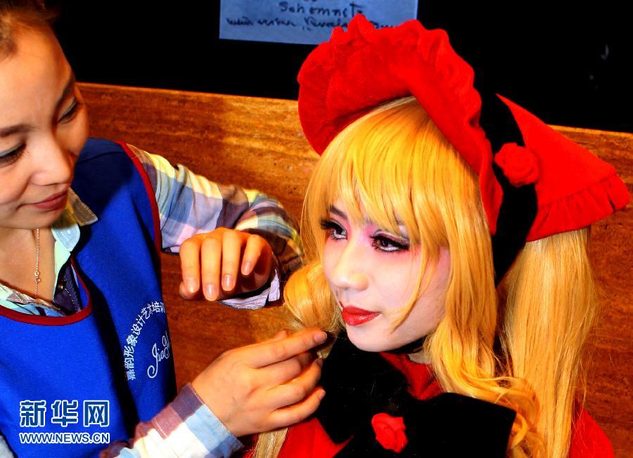 12月22日,化妆师在为模特做造型。当晚,中国国际彩妆造型艺术节在上海环球金融中心启动。 新华社记者张明摄