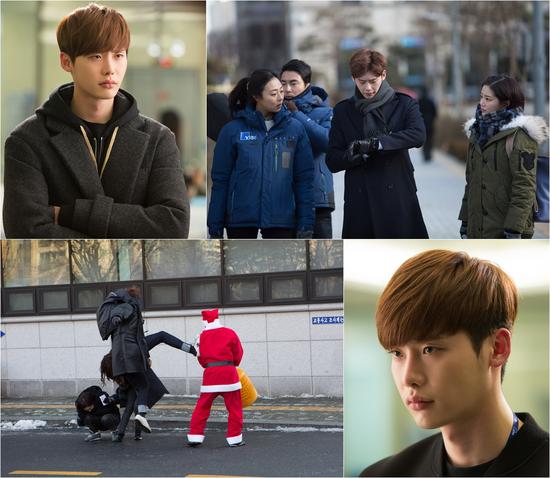 剧照中,李钟硕微皱眉头盯着某处思考,目光虽然充满疑问却非常锐利。而另一张剧照中,和衣物臃肿的同事们不同,李钟硕换上了干练的大衣表情紧张地确认着时间,情况似乎非常紧迫。此外,李侑菲为何惊恐地蜷缩着蹲在地上,李钟硕又为何飞踹“圣诞老人”,都让人十分好奇。