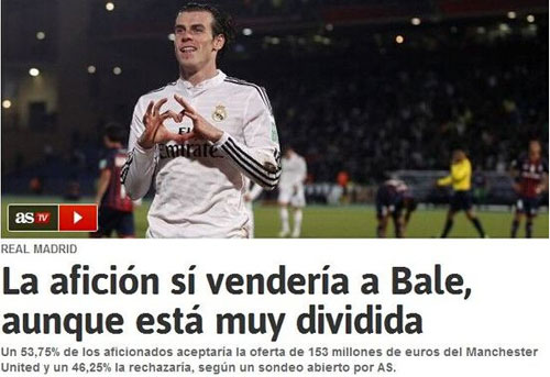 曼联愿意为贝尔支付1.5亿的转会费!这条新闻让不少皇马球迷的离场不再坚定。根据《阿斯报》的民意调查显示,有53.75%的皇马球迷表态支持俱乐部以1.5亿欧元的价格出售贝尔,看来,大圣在伯纳乌的路已经不再平坦。