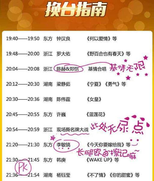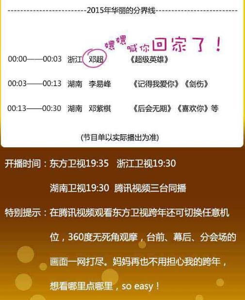 腾讯娱乐专稿(文/潘俊良 策划/阿桃仔)今夕不比往年,拿到“跨年执照”的就湖南、浙江、东方三家卫视。物以稀为贵,跨年战的“厮杀”变得更加刺激。今晚到底哪家强,湖南卫视主打“匆匆十年”怀旧风、浙江卫视延续“奔跑”没完没了、东方卫视召唤各路男神、女神“神气十足”,每一家都这么精彩,大拇指和遥控器应该经不起四个多小时的折腾,由腾讯娱乐提供贴心服务指南,不再错过最精彩的看点。