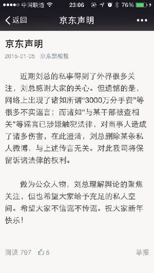 做为公众人物,刘总理解舆论的聚焦关注,但也希望大家给予充足的私人空间。希望大家不信谣不传谣。祝大家新年快乐!