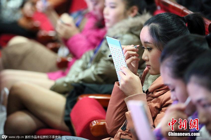 2015年1月7日讯,山东省泰安市,1月6日,2015中国空乘招募大赛华东赛区决赛和2015山东模特空乘专业艺考推介会在山东泰安文化艺术中心举行。大赛台下各高校美女都积极补妆准备,室外穿着羽绒服御寒,而男生们则集体就地做俯卧撑大秀肌肉身材。图片来源:CFP视觉中国