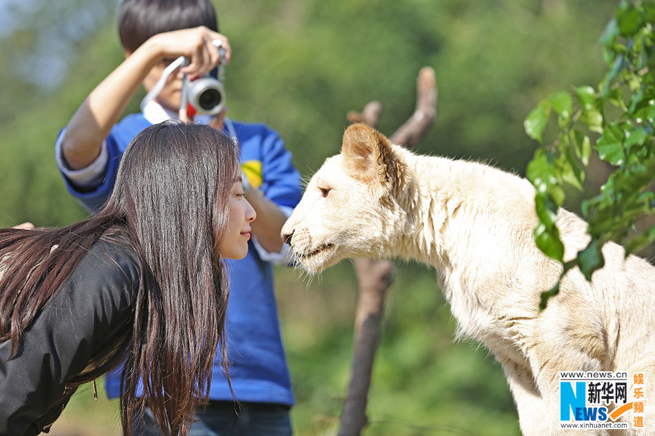 图:倪妮大胆与白狮亲昵 “喵总“降临猛兽变“萌兽“