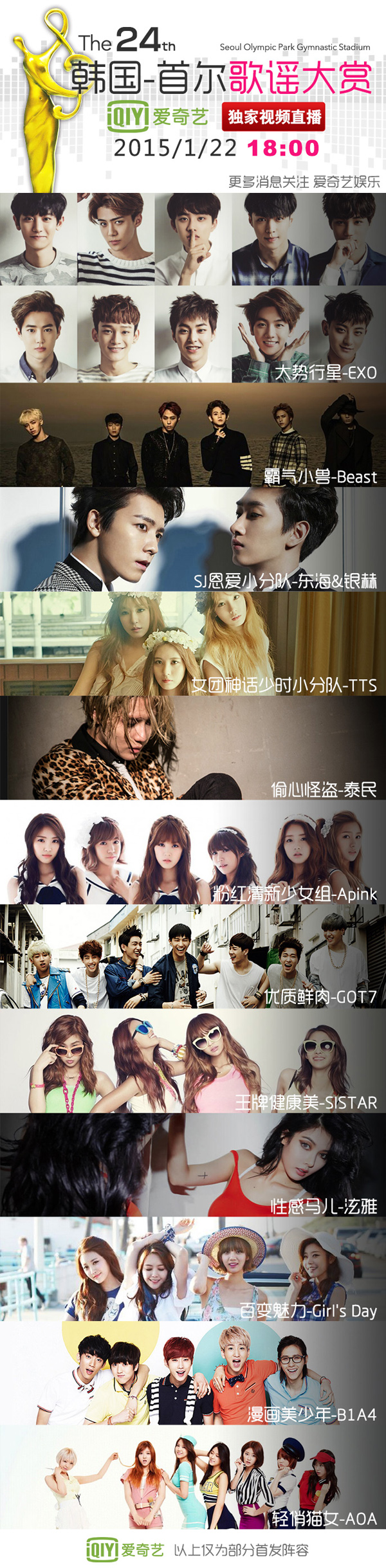 1月22日 18:00-21:00(北京时间),第24届首尔歌谣大赏即将在韩国举行。爱奇艺作为其独家视频合作网站,将对本届大赏进行全程独家直播和全方位报道。同时,根据入围艺人在爱奇艺的播放数据以及搜索数据综合评选出的“爱奇艺人气大赏”也将在现场颁布。目前,Beast、Infinte、EXO、泰民、VIXX、B1A4、GOT7、Winner、AOA、APINK等韩国音乐界大势组合和热门歌手已经入围本届大赏。