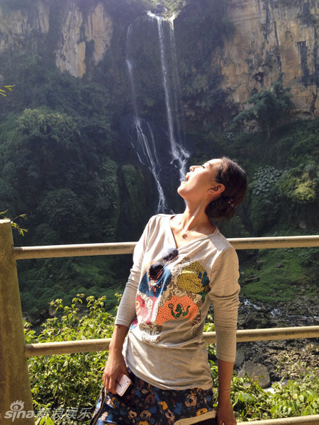 组图:周海媚游山玩水显清新 童心未泯桥上劈叉