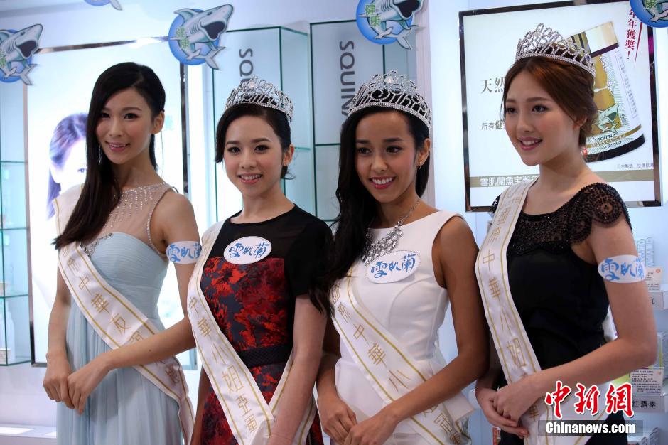 1月28日,《2015国际中华小姐竞选》获奖佳丽在香港出席选美赞助商举行的颁奖活动。图为(左起)友谊小姐金诗迪(奥克兰)、亚军邵佩诗(香港)、冠军蔡美霆(悉尼)及季军惠榉乔(纽约)。中新社发 洪少葵 摄