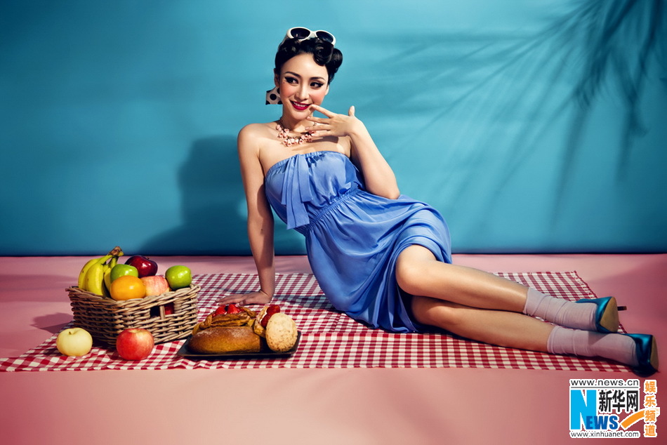 柳岩身穿蓝色抹胸短裙,黑色高跟鞋内着一双白色袜子,纯粹的复古画报女郎扮相,优雅地坐在格子棉布上,颜色鲜艳的水果随意地滚落在身边,仿佛置身阳光明媚的公园草地,毫不设防的甜美微笑给人带来开朗好心情;随后她又换上一身桃红格子吊带小背心和印花短裙,齐肩的大波浪发型更增添复古气质,只见她慵懒地坐在高脚木凳上,不禁让人联想起上个世纪荧幕上经典女星形象,带点漫不经心,却散发摄人魂魄的美艳;随着拍摄,柳岩的情绪渐入佳境,她用一根波点发带束起长发,深蓝色漏背礼裙被她演绎得充满风情,时而抱着红色皮箱一副说走就走的洒脱表情,时而拿起旧式电话机,眼波流转,好像在于远方的恋人通话。