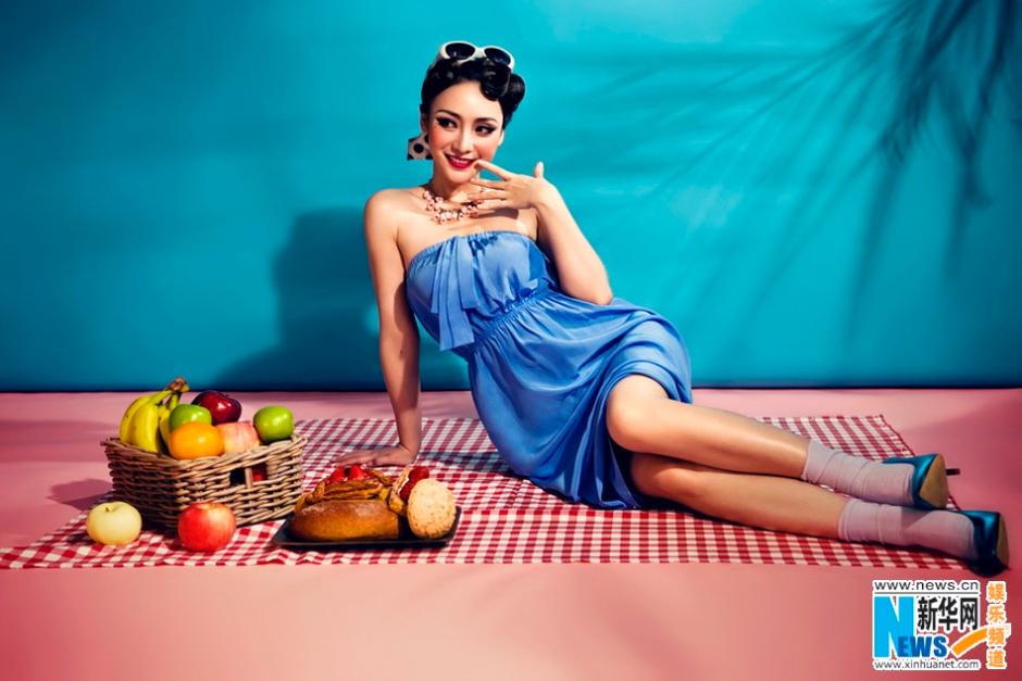柳岩身穿蓝色抹胸短裙,黑色高跟鞋内着一双白色袜子,纯粹的复古画报女郎扮相,优雅地坐在格子棉布上,颜色鲜艳的水果随意地滚落在身边,仿佛置身阳光明媚的公园草地,毫不设防的甜美微笑给人带来开朗好心情;随后她又换上一身桃红格子吊带小背心和印花短裙,齐肩的大波浪发型更增添复古气质,只见她慵懒地坐在高脚木凳上,不禁让人联想起上个世纪荧幕上经典女星形象,带点漫不经心,却散发摄人魂魄的美艳;随着拍摄,柳岩的情绪渐入佳境,她用一根波点发带束起长发,深蓝色漏背礼裙被她演绎得充满风情,时而抱着红色皮箱一副说走就走的洒脱表情,时而拿起旧式电话机,眼波流转,好像在于远方的恋人通话。 图片来源:新华网