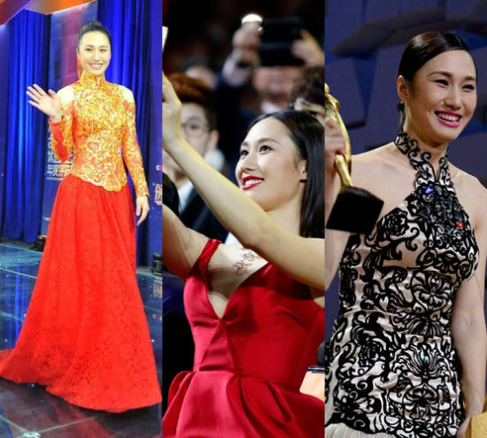 此次活动最耀眼的女嘉宾当属张虹莫属,红毯上的她一身立领露肩烫金礼服搭配红色蕾丝长裙尽显端庄典雅,复古盘发以及红润的妆容更是将其塑造成一尾福气满满的锦鲤,多看一眼都似乎会沾染好运气。而在随后开场表演上,她换装成一席深V超低胸绸缎裙,酥胸尽显美艳十足。虽然过足了漂亮瘾,可这深V礼服的装扮要是放在现行规定中,怕是重播时得裁成大头贴才行。