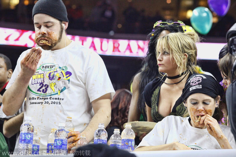 中国日报网2月2日电(高晴)美式足球2015年年度盛事“超级碗”日前开幕,作为传统节目之一的“鸡翅碗”大食比赛率先于1月30日在费城开赛。来自芝加哥的男选手贝尔托莱蒂(PatrickBertoletti)在26分钟内鲸吞444只鸡翅,夺冠并刷新纪录。