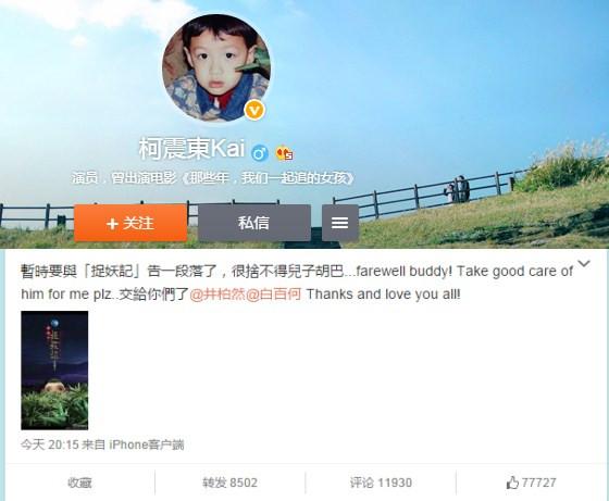腾讯娱乐讯 昨日,柯震东在微博透露,将暂别《捉妖记》,并@井柏然@白百何,拜托两位照顾好电影中的“儿子”萌妖胡巴。随后,井柏然在微博回应柯震东,让其放心。这也意味着,井柏然将正式接棒柯震东出任电影《捉妖记》男主角。