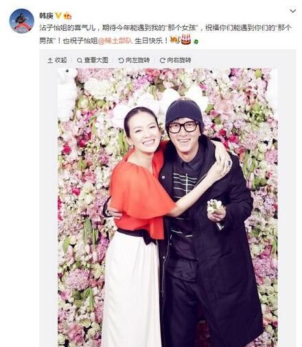 韩庚留言称,“沾子怡姐的喜气儿,期待今年能遇到我的‘那个女孩’,祝福你们能遇到你们的“那个男孩”!也祝子怡姐生日快乐”。
