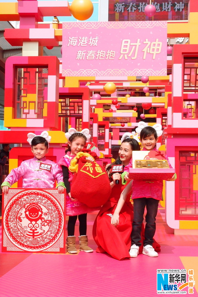 Angelababy开心抱财神喜迎羊年 红裙红唇一红到底