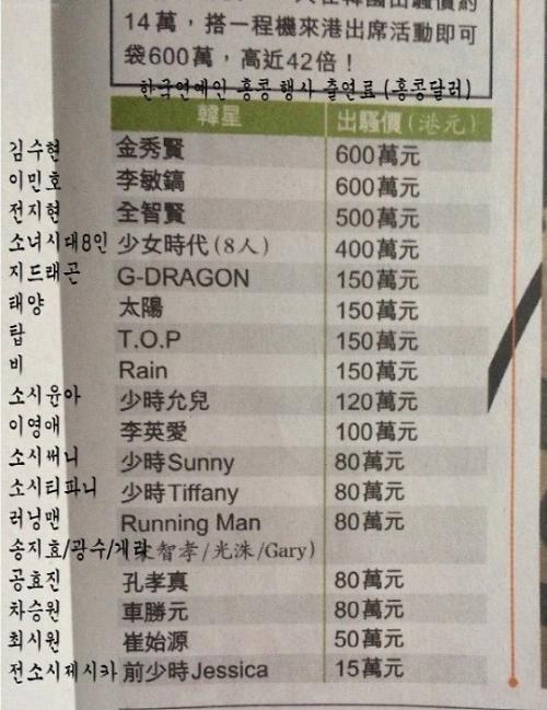 在公开的照片中,李敏镐和金秀贤在香港的出场费用为600万港币(约合人民币483万元),并列第一。