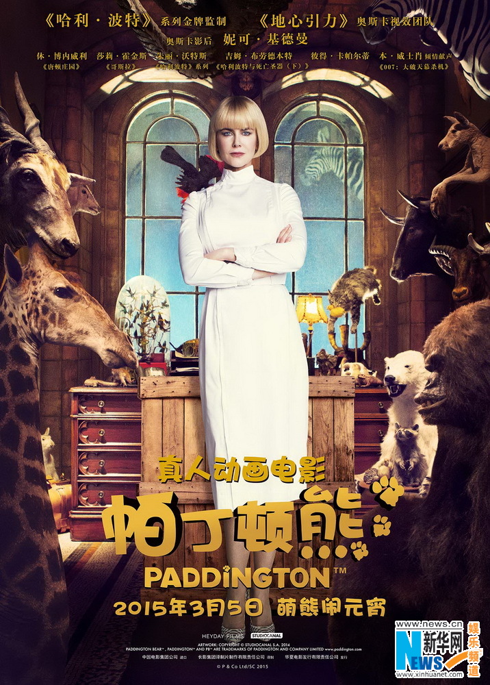 真人动画电影《帕丁顿熊》近日公布了中文版人物海报,主演妮可•基德曼、休•博内威利、吉姆•布劳德本特、莎莉•霍金斯、彼得•卡帕尔蒂与小熊帕丁顿分别以剧中造型亮相,也正式公布了该片在中国的上映日期为3月5日,正值农历正月十五元宵节。选择这样一个档期,也正好迎和了影片“合家欢”的定位。