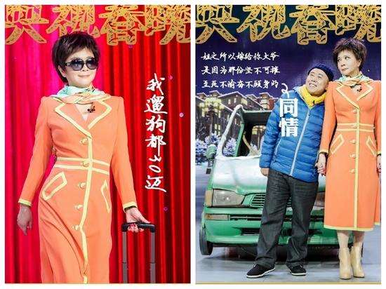 蔡明身穿嫩橘色长大衣完美还原了“大龄富婆”这一形象,她们往往爱用短发和刻薄伪装自己,而“装嫩”却又是让她们难以抗拒的潘多拉魔盒,只要一不小心就暴露了自己对时光流逝的畏惧感,穿着这一身的搭配走在香榭丽大街上配上吉娃娃一定更合适,但是那双过踝裸色皮靴让她看起来像是直接一脚踩进地板了一样。