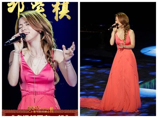 邓紫棋在春晚舞台上扮演的是一位家境贫寒,为了出席朋友婚礼只能铤而走险自己裁制衣服的可怜姑娘,极细的肩带和下身层层叠叠的裙摆实在不成比例,为了掩饰廉价感而向表姐们借来的一串串项链一不小心就卡进了沟里,辛辛苦苦梳起来的伴娘头配上粉色的礼服也是非常合适敬酒以及数红包钱。
