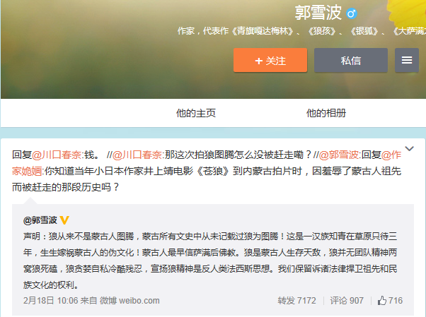 郭雪波是中国作协会员,中国环境文学研究会副会长,著有长篇小说《大漠狼孩》、《狐啸》,中篇小说集《沙狼》等。1980年代他曾在内蒙古社科院文学所专门从事蒙古族历史文化研究几年,自认为“对自己民族的历史还是了解的”。2月18日,他在微博发表了一则声明:“狼从来不是蒙古人图腾,蒙古所有文史中从未记载过狼为图腾!这是一汉族知青在草原只待三年,生生嫁祸蒙古人的伪文化!蒙古人最早信萨满后佛教。狼是蒙古人生存天敌,狼并无团队精神两窝狼死磕,狼贪婪自私冷酷残忍,宣扬狼精神是反人类法西斯思想。我们保留诉诸法律捍卫祖先和民族文化的权利。”