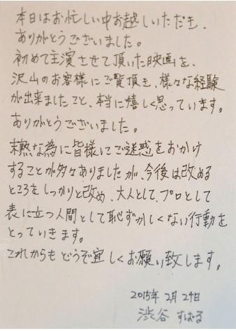 他会更加努力配合宣传,作为一个成年人表现出专业艺人的一面,希望大家能够原谅他此前在节目宣传中的不好表现。现场发表的道歉信由涩谷昴亲笔写下,这样的形式相当罕见,令在场的记者和观众也大感意外。
