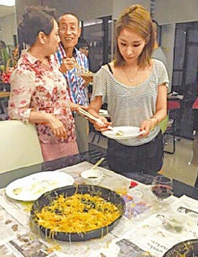 萧亚轩(右)在石家餐桌旁夹取食物。