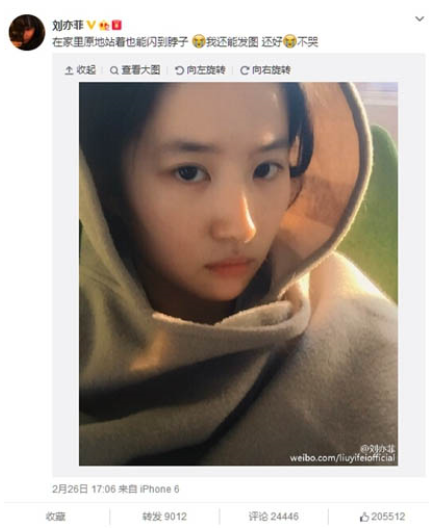 昨日(2月26日)下午,刘亦菲在微博晒出自拍照,并透露在家里站着却闪到脖子,“我还能发图,还好,不哭”。