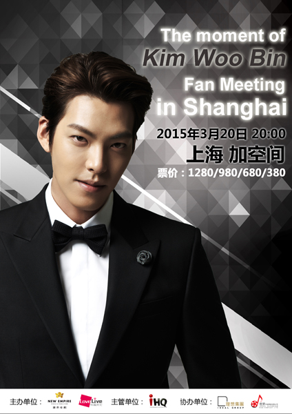 韩国新一代魅力男星金宇彬的“The moment of Kim Woo Bin Fan Meeting in Shanghai”已定于2015年3月20日20点在上海加空间举行。据主办方新帝传媒和乐福文化告知,金宇彬 “The moment of Kim Woo Bin Fan Meeting”中国巡回见面会之上海站将于2月26日下午2点在大麦网开始预售。票价为1280元/980元/680元/380元