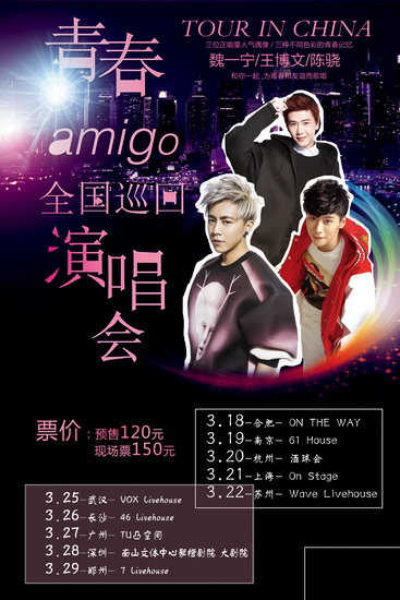 电童娱乐旗下东方三少:温暖男生王博文、游走在音乐世界里的小顽童魏一宁、时尚潮男陈骁在北京成功举办极秀青春AMIGO演唱会之后,继续在2015年3月十大城市开跑。
