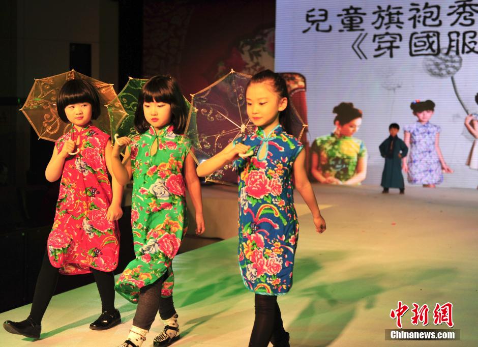 3月6日,在“三八”国际妇女节来临之际,一场展示“中国传统旗袍文化风采”活动在济南举办,图为儿童模特展示旗袍。中新社发 张勇 摄