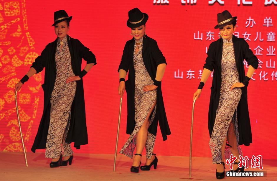 3月6日,在“三八”国际妇女节来临之际,一场由业余模特着旗袍演绎的“中国传统服饰文化风采”展示在济南举办,中年美女们舞动腰身,展现成熟韵致。中新社发 张勇 摄