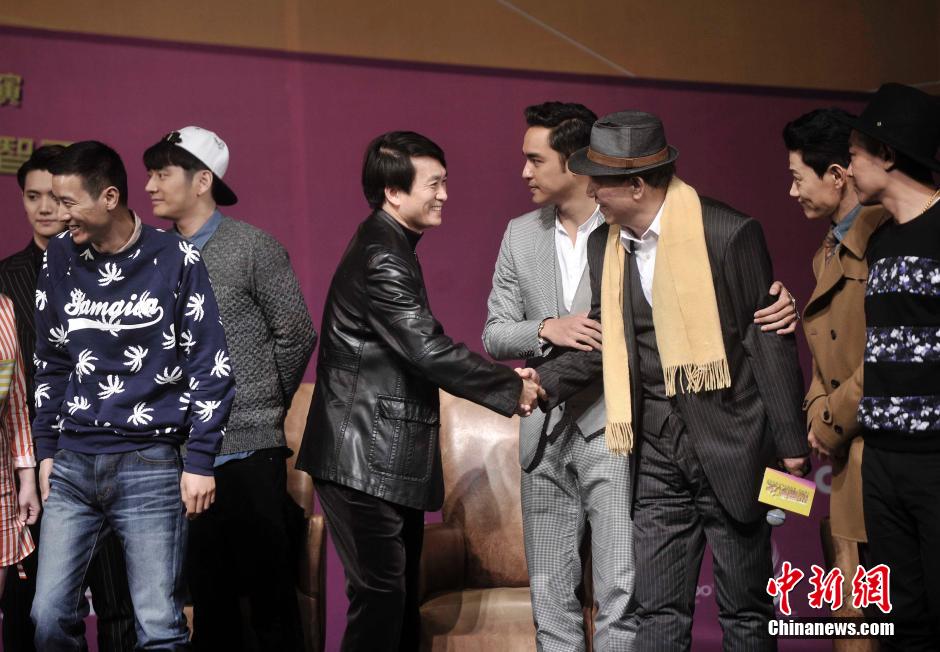 图为中国新闻网副总裁、北京南海影业有限公司副总经理吕振亚与电影《恋爱教父》总策划柯俊雄握手庆贺。陈超 摄