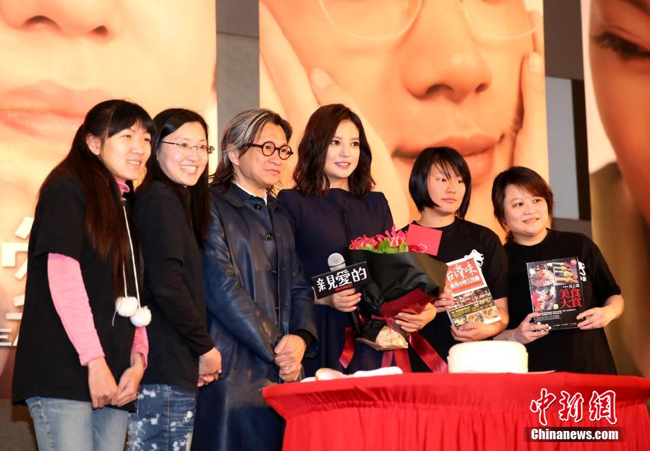 3月7日,台北粉丝为大陆知名演员赵薇(右三)送上蛋糕和美食书籍,提前为赵薇庆祝生日。当天,香港导演陈可辛(左三)与赵薇在台北出席记者会,为13日即将在台上映的电影《亲爱的》造势。 中新社发 陈小愿 摄