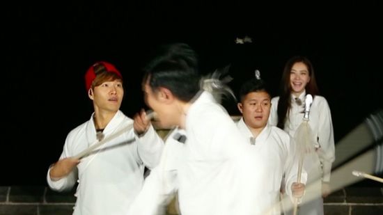 第二轮的考验比拼的是柔韧性,明星们身穿标有刻度的长裤,头上戴着印章,通过抬腿动作来盖章,每组盖上的长度总和最大即可获胜。值得一提的是,郭京飞、安七炫、金圣洙这一组三个男生且平均年龄最大,他们是否会因此垫底呢?