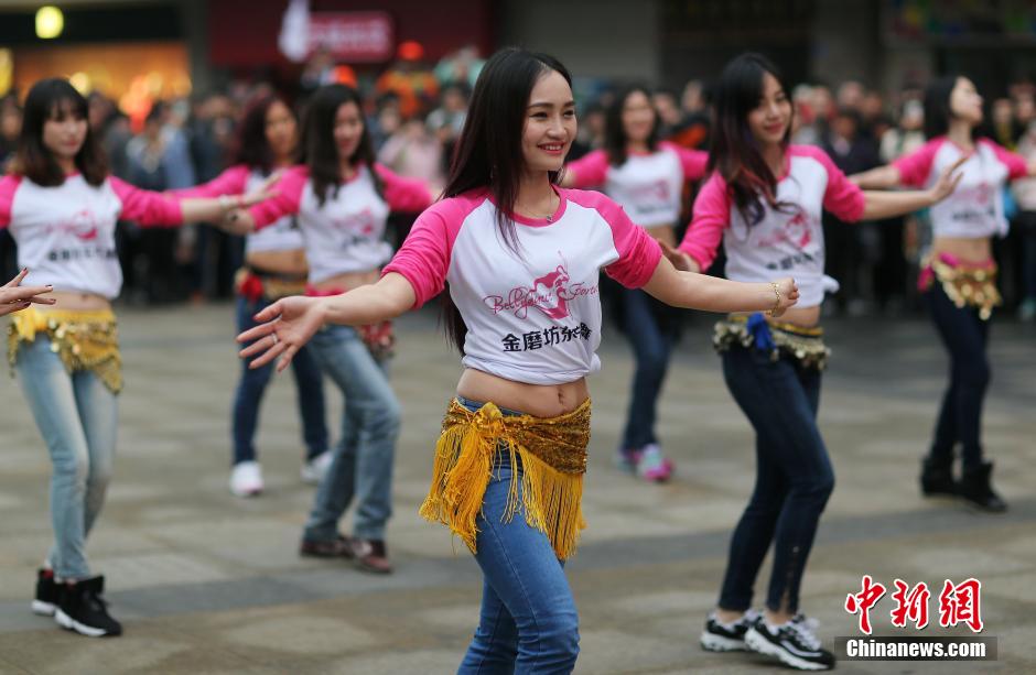 3月8日,一群靓女出现在南京新街口闹市,伴随着音乐舞动肚皮舞玩快闪。据了解,这群靓女中大多数是做了母亲的辣妈,她们用舞蹈的方式在欢乐中度过愉快的三八妇女节。中新社发 泱波 摄